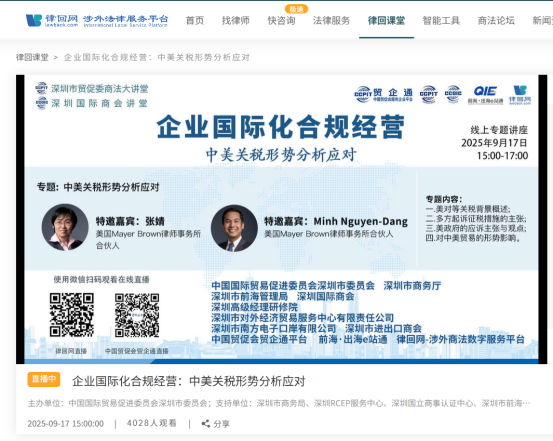 9月17日下午,由深圳市贸促会主办的“企业国际化合规经营:中美关税形势分析应对”线上讲座成功举行。本次活动特邀国际知名律所Mayer Brown华盛顿办公室的张婧律师团队,围绕中美关税热点问题为企业提供专业分析与应对建议。讲座通过中国贸促会“贸企通”平台、中国国际商会视频号及“律回中国”平台同步播出,共吸引4028人次在线观看,反映出企业对当前国际贸易环境下合规经营的高度关注。