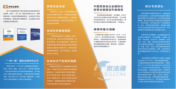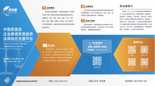 贸法通(cti1s.com)由中国贸促会法律事务部主办,是以在线咨询为主体,集法律查明、案例查询、经贸预警、培训会议、交流互动等为一体的涉外商事法律公共服务平台,通过网站、微信公众号、App等途径帮助企业解决在跨境贸易投资中遇到的法律问题,包括知识产权、风险防范、争端预防和解决、贸易救济、出口管制和经济制裁、反垄断、国家安全审查、企业海外利益保护和预警等。
