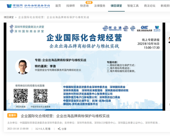 10月16日下午,深圳市贸促会成功组织召开了“企业国际化合规经营:企业出海品牌商标保护与维权实战”线上专题讲座。本次活动特邀中国贸促会专利商标事务所国内商标处处长李渤担任主讲嘉宾,聚焦于企业国际化进程中的品牌商标保护与维权实务,旨在系统提升企业在海外市场进行知识产权布局与防御的能力。讲座通过在线平台进行,吸引了广大外向型企业的积极参与,实时参会人次达3424,充分体现了企业对出海合规及知识产权风险管理的高度重视。