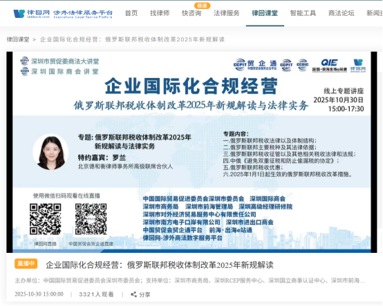 随着“一带一路”倡议的深入实施和中俄经贸关系的持续升温,俄罗斯联邦已成为深圳企业海外布局的重要目标市场。为助力深圳外向型企业精准把握政策动向,有效规避税务风险,优化在俄经营策略,深圳市贸促会于10月30日下午成功举办了“企业国际化合规经营:俄罗斯联邦税收体制改革2025年新规解读与法律实务”线上专题讲座,共计3321人次参会,反响热烈。