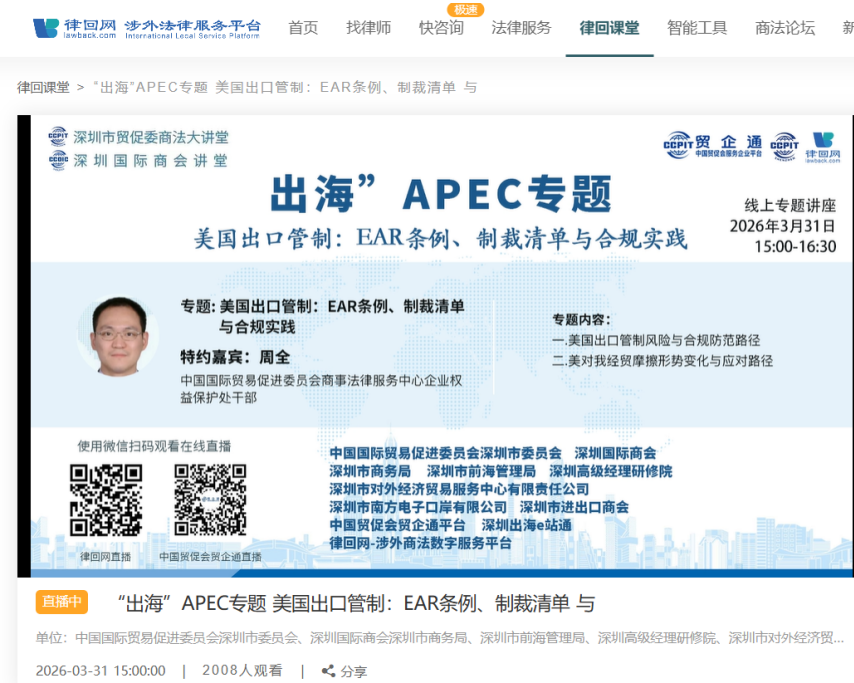 为精准服务我市企业高质量“出海”发展,积极应对中美经贸摩擦背景下日益复杂的出口管制挑战,助力企业切实提升出口管制合规意识与风险应对能力,深圳市贸促会于3月31日下午成功举办“美国出口管制:EAR条例、制裁清单与合规实践”线上专题讲座。本次活动由深圳市贸促会主办,得到了市商务局、市前海管理局、深圳国际商会、深圳高级经理研修院、市对外经济贸易服务中心有限责任公司、市南方电子口岸有限公司、市进出口商会等单位的大力支持,吸引了对美贸易、投资及有意开拓美国市场的企业代表2008人次线上参会。