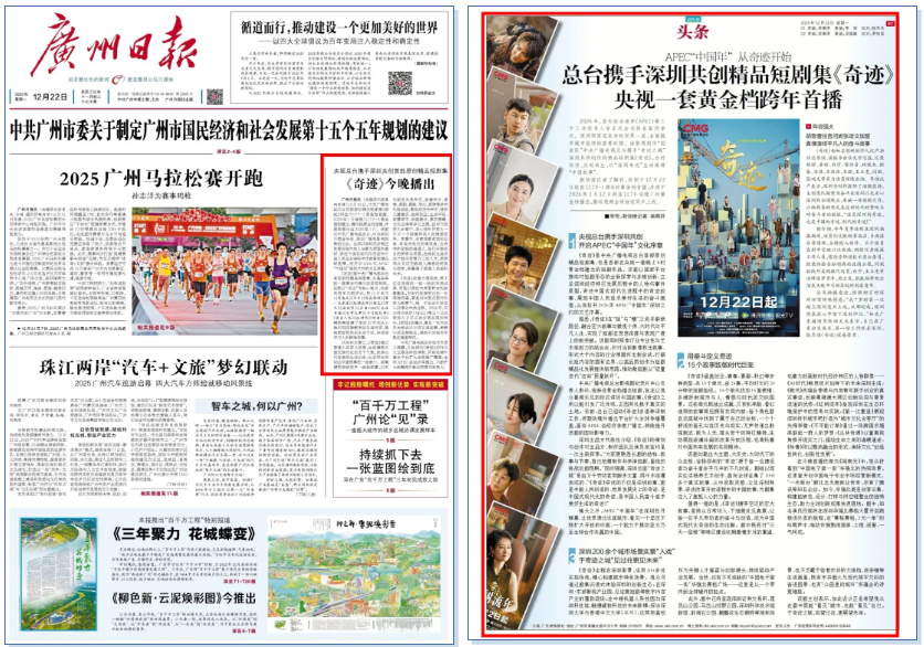 12月22日晚8点,由中央广播电视总台携手深圳共创的精品短剧集《奇迹》在CCTV-1黄金档首播。这是总台首部原创精品短剧集,也是CCTV-1晚八点黄金档播出的首部短剧集。