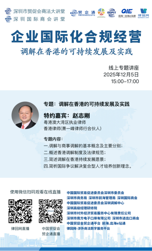 为赋能国际争议解决实务,助力企业把握商事调解及国际争议解决机制的核心逻辑与实践路径,深圳市贸促会将于12月5日(星期五)举办“调解在香港的可持续发展及实践”线上讲座,邀请粤港澳大湾区执业律师赵志刚系统梳理香港调解制度框架,并探讨复合型争议解决人才培养的创新模式,以服务于高水平对外开放和多元化纠纷解决机制建设的需要。现诚邀本市进出口外贸企业代表及调解员等线上参与。